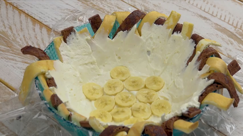 4.) Schlage den Frischkäse mit dem Zucker, dem Zitronenabrieb und dem Vanillearoma schaumig und hebe dann die geschlagene Sahne unter. Streiche einen Teil der Creme auf das Gitter in der Schüssel. Dann arrangiere Bananenscheibchen darauf. Bedecke diese wieder mit weiterer Creme.