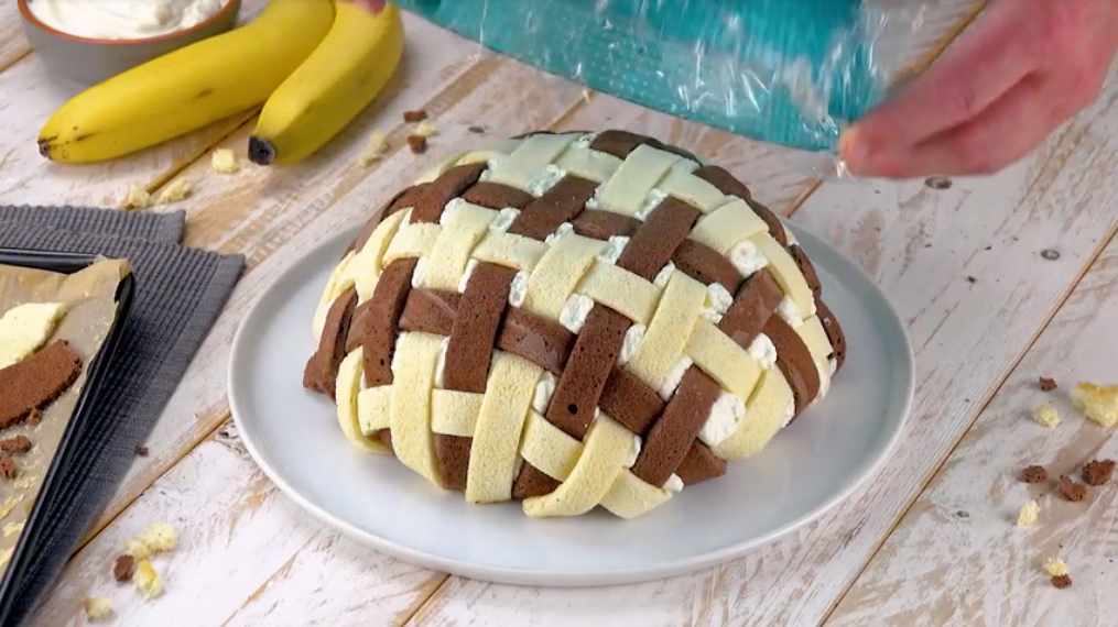 2.) Jetzt nimm die Böden vorsichtig vom Blech und lasse sie in feuchten Tüchern auskühlen. So werden sie elastisch und brechen später beim Flechten nicht durch. Schneide die Böden mit Hilfe eines Lineals in gleichmäßige dünne Streifen. Bedecke die Arbeitsplatte mit einer Lage Klarsichtfolie und flicht darauf aus den hellen und den dunklen Streifen das Gitter.