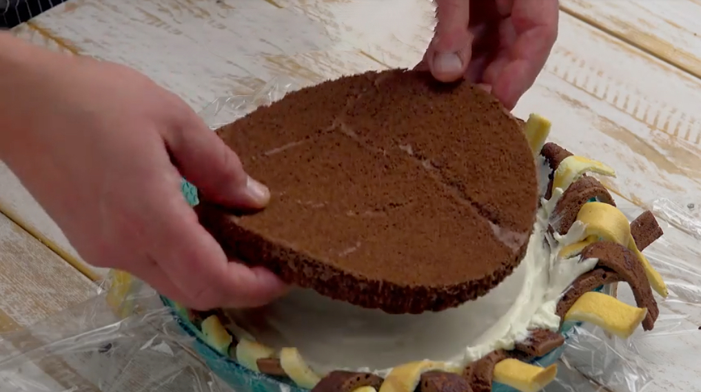 5.) Lege den hellen Biskuitboden auf die Cremeschicht. Darüber kommen wieder erst Frischkäsecreme, dann Bananenscheiben, dann wieder Creme und zum Schluss der dunkle Biskuitboden.