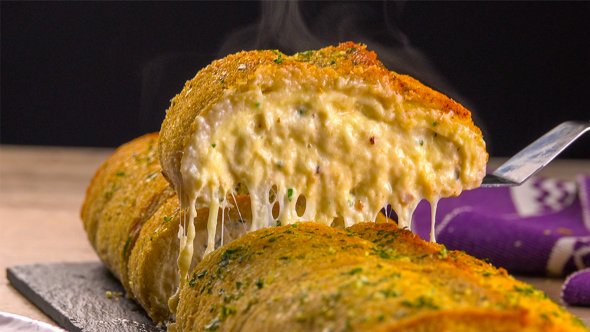 5.) „Chicken Alfredo“-Knoblauch-Rolle Für die einen mag es sinnlos und sonderbar erscheinen, aus einem in Scheiben geschnittenen Brot ein neues zusammenzusetzen, für andere hingegen ist das der Grundstein eines genialen Gaumenschmauses. Versuchen wir einfach, Gruppe eins umzustimmen. Diesem außen knusprigen und innen cremigen Brotröllchen zu widerstehen, wird nämlich schwer!
