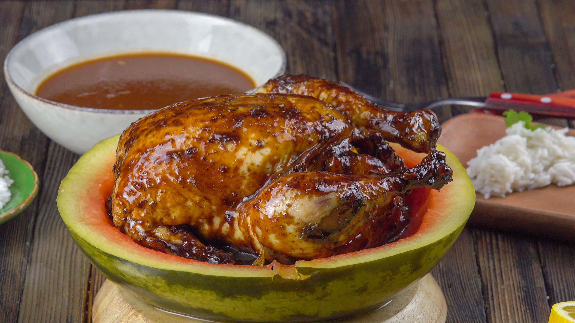 8.) Melonen-Hähnchen Wassermelone ist die perfekte Sommerfrucht! Nicht nur besteht das Fruchtfleisch zu rund 96 % aus Wasser, von dem man bei hohen Temperaturen unbedingt viel zu sich nehmen sollte. Das Obst enthält außerdem wertvolles Vitamin A und C, Protein sowie Antioxidantien. Dieses Rezept beweist, dass die grüne Kugel auch richtig flexibel ist: Du kannst nämlich mindestens ein sehr leckeres Hauptgericht mit ihr zaubern. Die Melone dient dabei als Form und bietet zugleich einen Zusatz zur Soße!