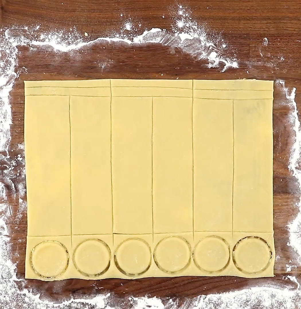 Rolle den Teig auf einer bemehlten Arbeitsfläche aus und stich sechs kleine Kreise aus. Den Rest des Teiges schneidest du in sechs große, dicke Streifen und in weitere sechs kurze, dünne Streifen.