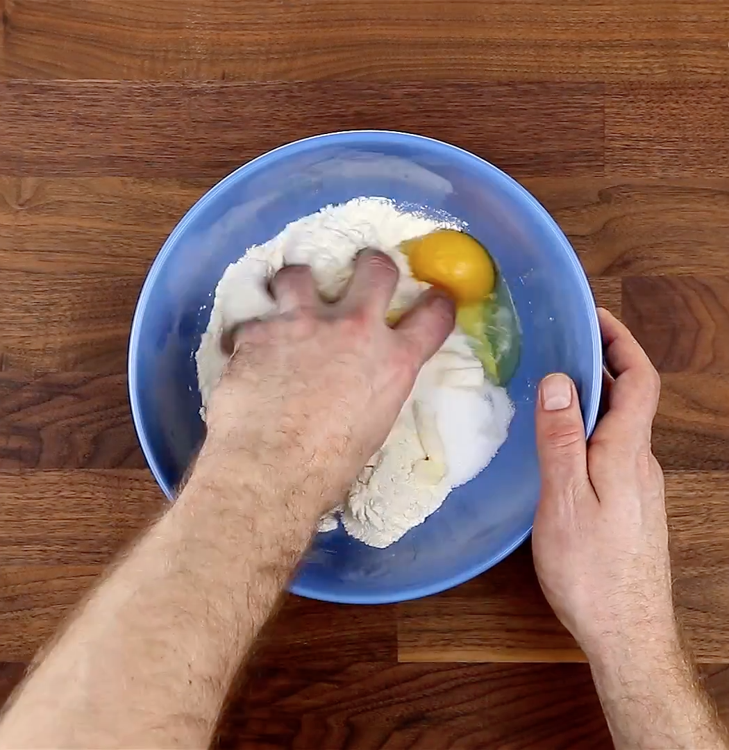 Gib Mehl, Butter, Zucker, Salz und Ei in eine Schüssel und verknete deine Zutaten zu einem Teig.