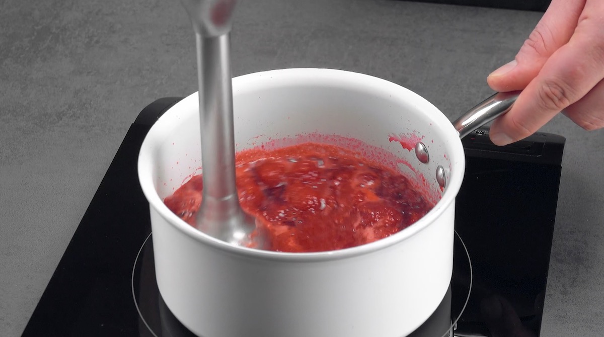 2.) Koche Himbeeren mit Zucker im Topf auf und püriere sie anschließend.