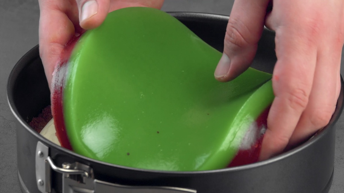 6.) Nimm vorsichtig die zwei Wackelpuddingschichten aus der kleineren Springform heraus und platziere sie mittig auf der Joghurtcreme.