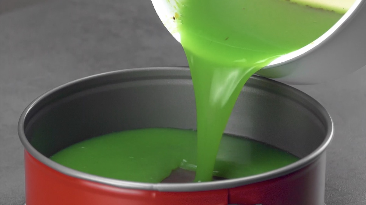 4.) Stelle den Wackelpudding mit Kiwigeschmack genauso her wie zuvor den Wackelpudding mit Himbeergeschmack. Gieße ihn dann auf den fest gewordenen Himbeerwackelpudding und stelle das Ganze erneut in den Kühlschrank, bis auch der Kiwiwackelpudding fest geworden ist.