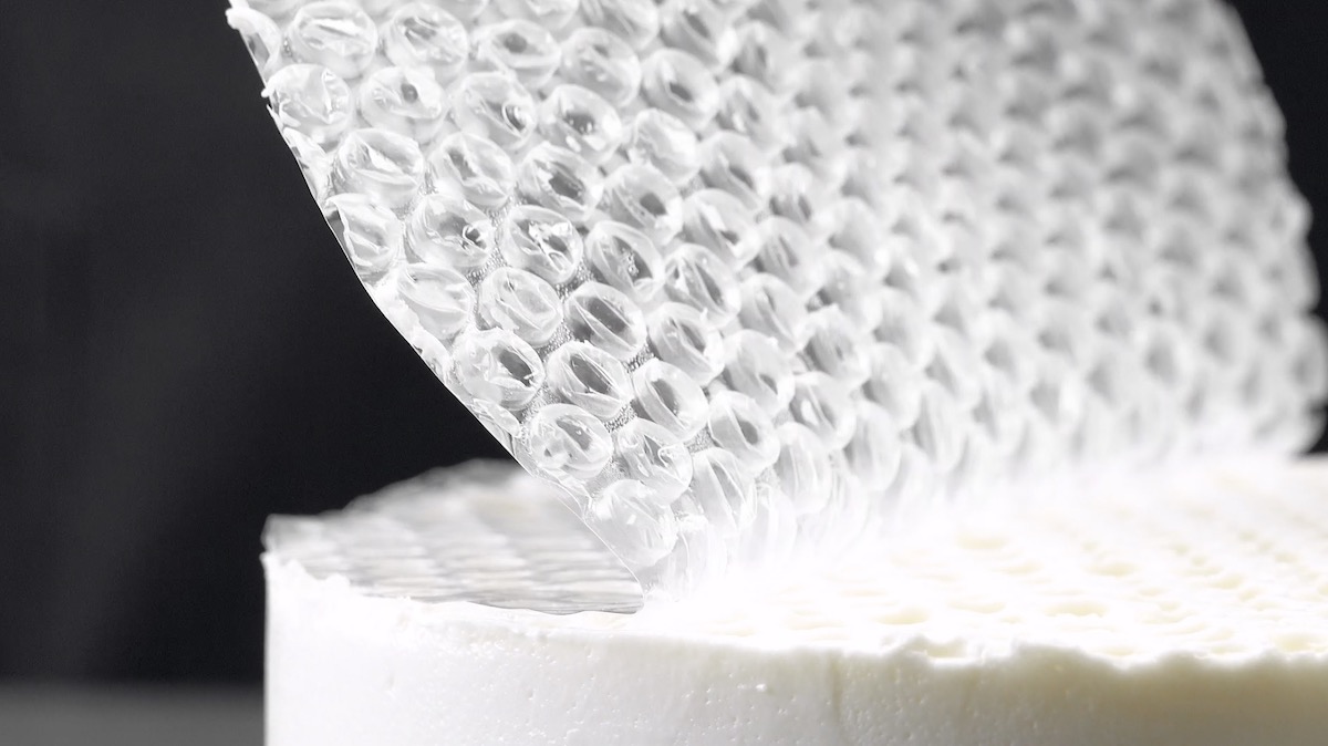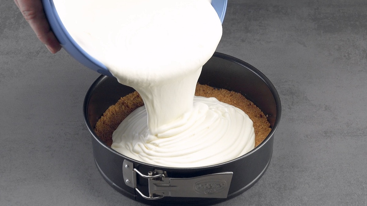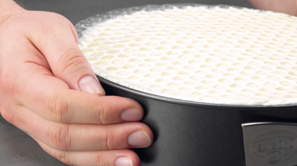 8.) Schneide die Luftpolsterfolie so zu, dass sie den Durchmesser der größeren Springform hat. Lege sie vorsichtig auf die Joghurtcreme und drücke sie leicht an, sodass sich die Luftblasen in die Joghurtcreme drücken. Stelle den Kuchen dann samt der Luftpolsterfolie für mindestens 4 Stunden in den Kühlschrank.