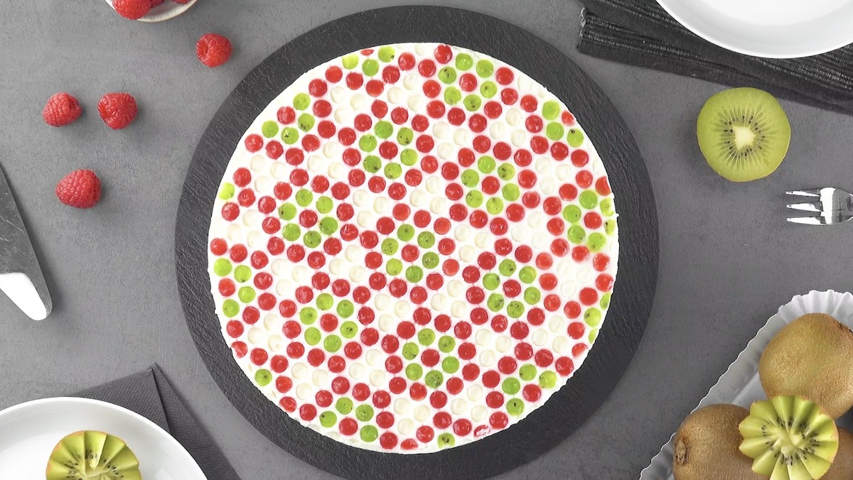 Dank Luftpolsterfolie, Wackelpudding und Fruchtsoße ist dieser Kuchen wirklich zu einer wahren Schönheit geworden – und das ganz ohne Backen!