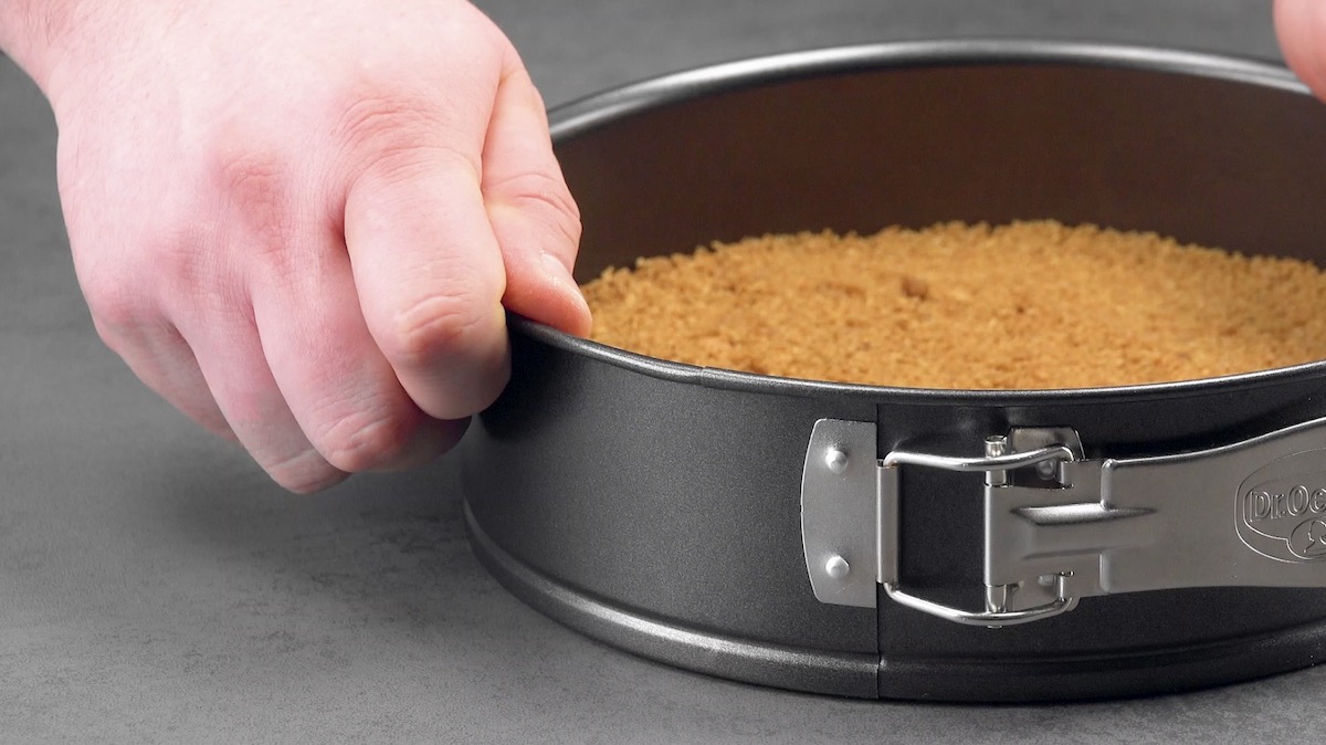 1.) Zerkleinere die Kekse für den Boden und vermenge sie mit der geschmolzenen Butter. Gib die Masse nun in die größere Springform, drücke sie am Boden an und stelle die Form in den Kühlschrank, damit die Schicht fest wird.