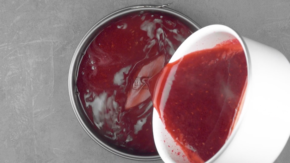 3.) Stelle etwa 2/3 der Fruchtsoße für die spätere Dekoration zur Seite. Vermische nun die übrige Fruchtsoße mit Wasser und Wackelpuddingpulver und koche das Ganze kurz auf. Fülle den heißen Himbeerwackelpudding dann in die kleinere Springform und stelle ihn zum Abkühlen und Festwerden in den Kühlschrank.