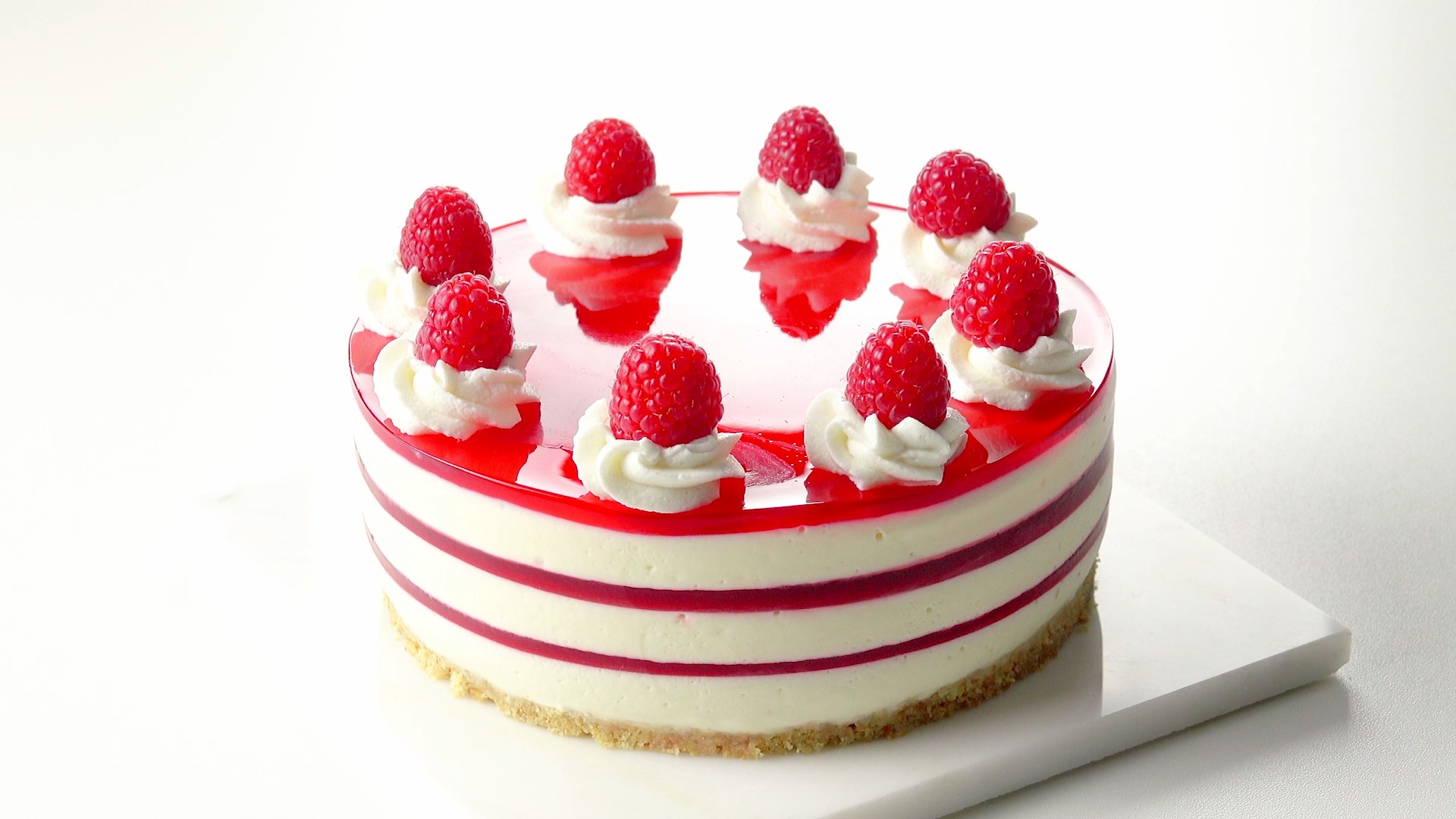 4.) Stelle den ganzen Kuchen zum Schluss noch einmal 4 Stunden kalt, bis er ganz durchgekühlt ist. Dekoriere ihn nun mit Sahneklecksen und setze jeweils eine frische Himbeere darauf.