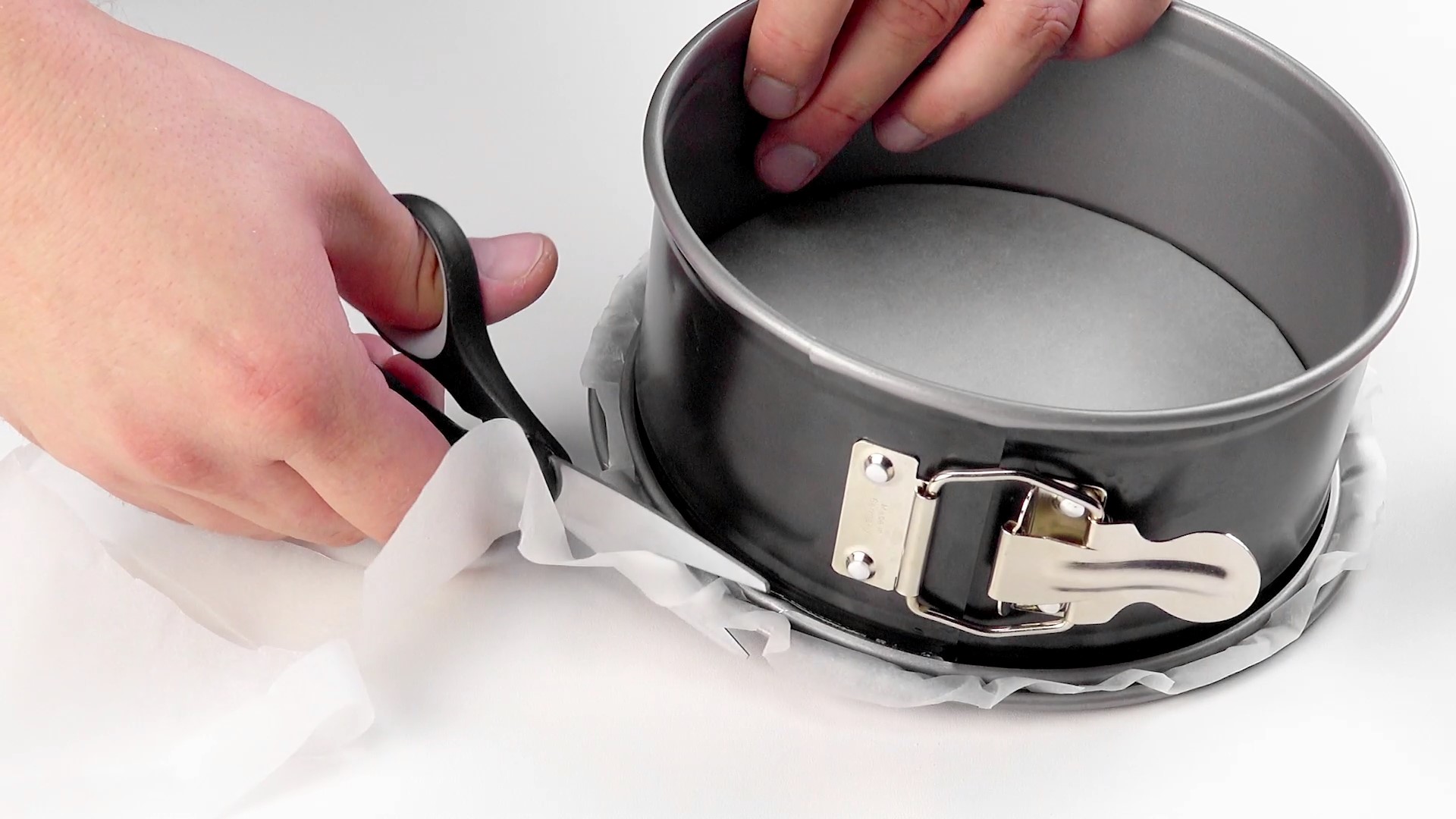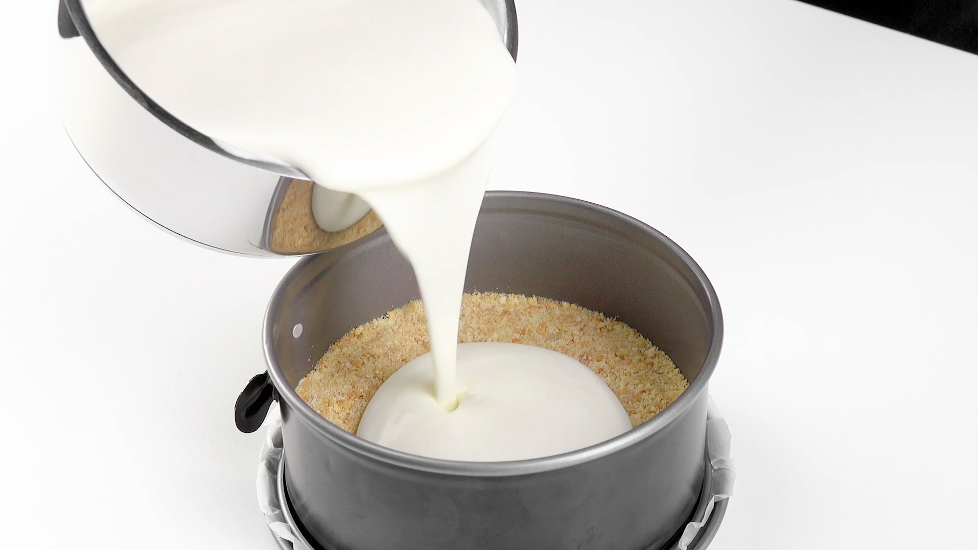 So geht es: 1.) Zerkleinere für den Boden die Kekse und mische die Krümel gründlich mit der flüssigen Butter. Lege nun ein Blatt Backpapier auf den Boden einer Springform (Durchmesser: 18 cm), setze den Ring darauf und befestige ihn auf dem Papier. Schneide danach den Rand des Papiers rundherum ab. Gib nun die buttrigen Kekskrümel auf den Boden der Springform und drücke sie mit einem Glas eben. Danach wird der Boden 30 Minuten lang gekühlt.