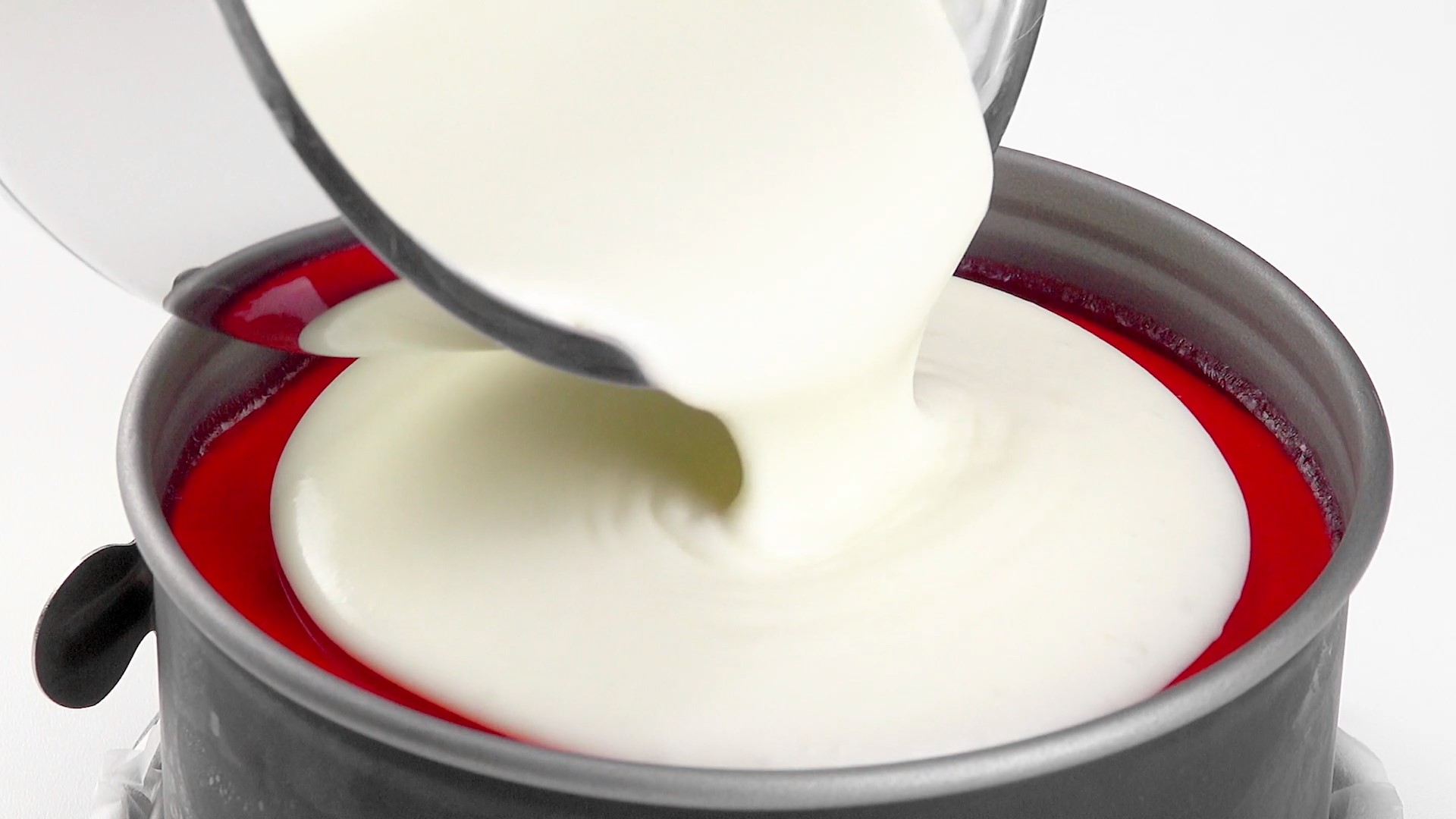 3.) Während die Creme herunterkühlt, stellst du die Götterspeise her. Erwärme dafür das Götterspeisenpulver, den Zucker und das Wasser zusammen in einem Topf und lass dann alles auf ca. 25 °C herunterkühlen. Gieße anschließend 1/3 der Götterspeise auf die Sahnecreme und stelle die Form wieder kühl. Wiederhole das Gießen der Schichten, bis beide Flüssigkeiten aufgebraucht sind. Stelle die Form nach dem Gießen jeder Schicht kalt.