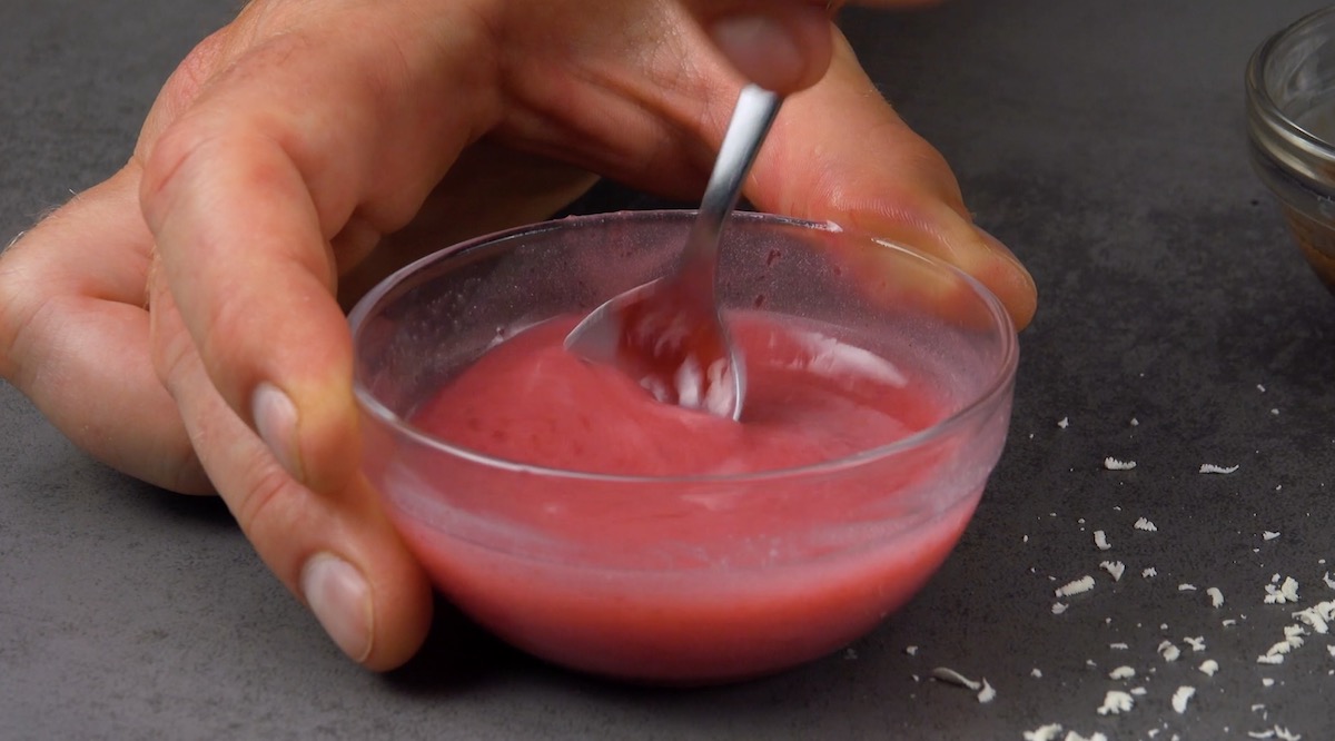 7.) Rühre die Erdbeermarmelade in das flüssige Erdbeereis.