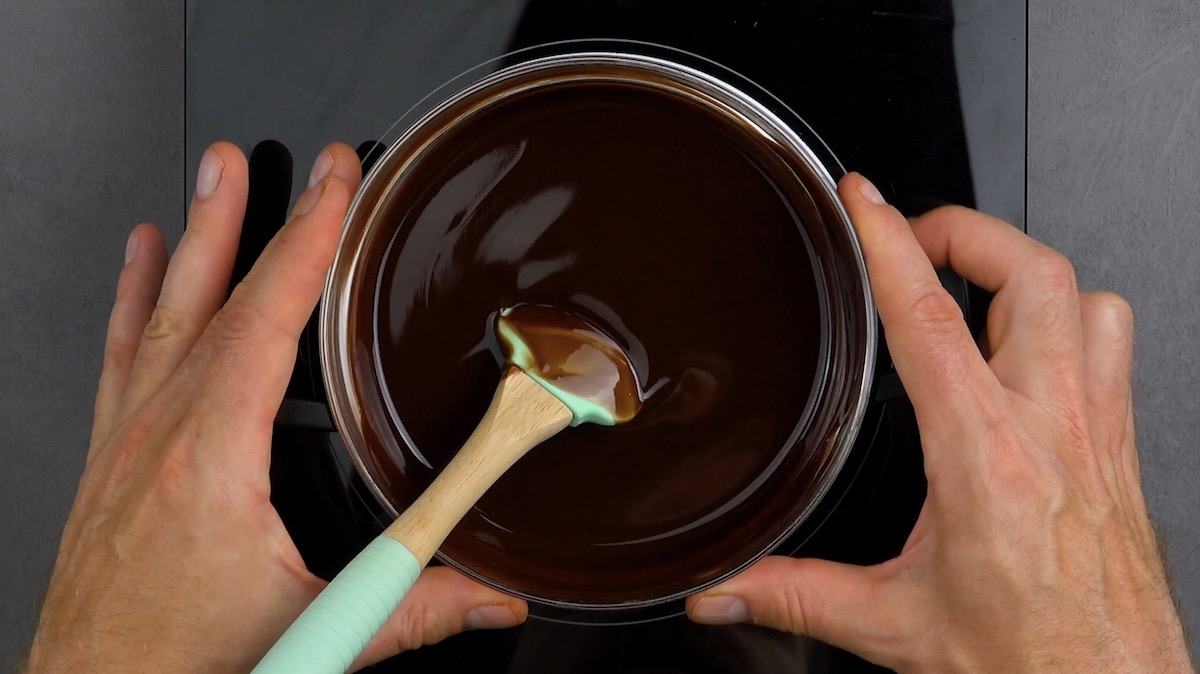 4.) Am nächsten Tag solltest du zunächst die Waffeln zubereiten: Schmilz dafür Butter zusammen mit dunkler Schokolade in einem Wasserbad und lass die Schoko-Butter-Masse dann etwas abkühlen.