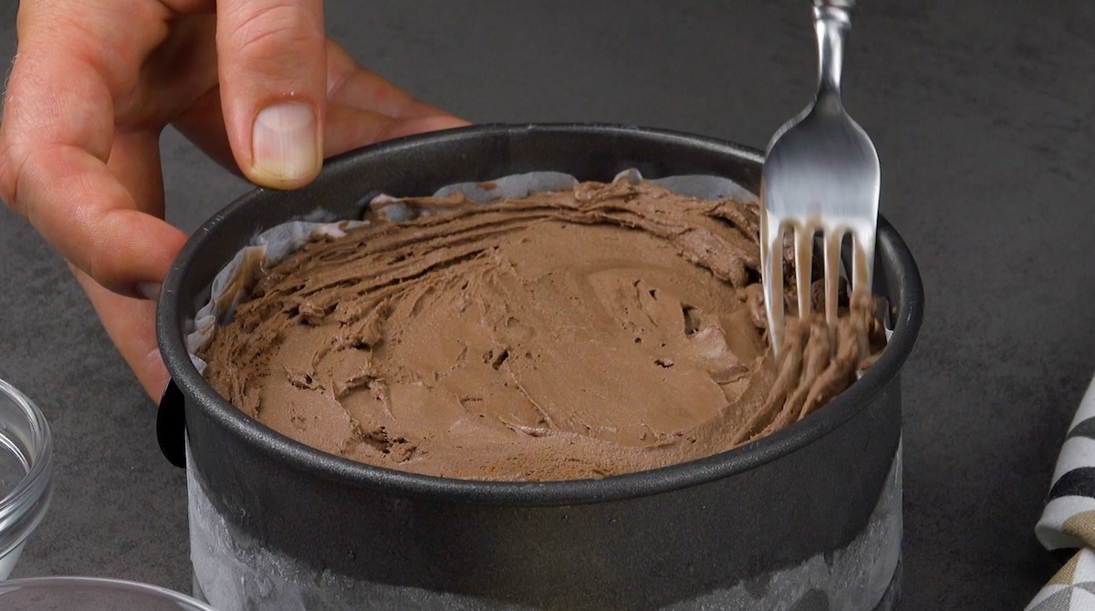3.) Nimm schließlich noch vom Schokoladeneis eine Kugel ab und friere sie ein. Gib dann den Rest des Schokoladeneises in die Springform. Stelle das geschichtete Eis jetzt für mindestens zwei Stunden, am besten jedoch über Nacht in den Tiefkühler.