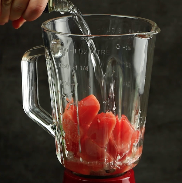 3.) Nun gibst du die Meloneneiswürfel in den Mixer, außerdem das Wasser und nach Belieben den Wodka, und zerkleinerst auch diese.