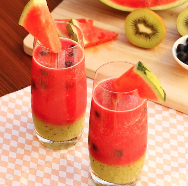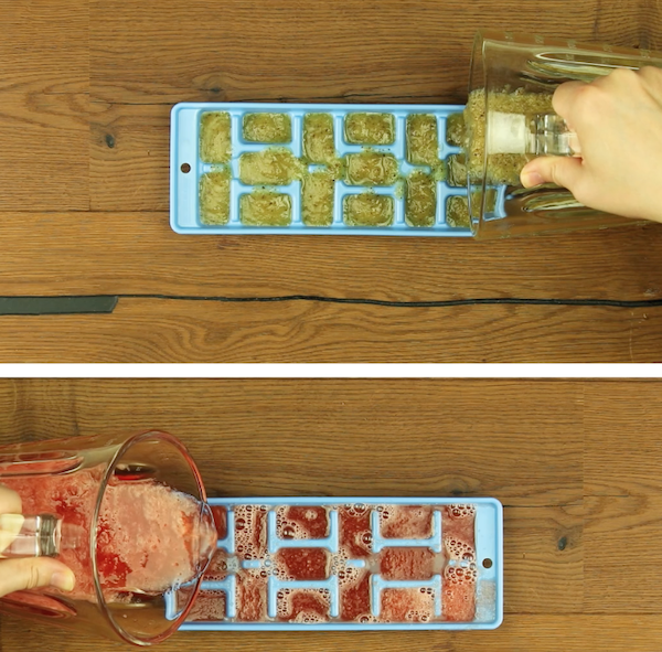 1.) Schäle und püriere die Kiwis in einem Mixer. Höhle die Wassermelone aus und püriere auch deren Fruchtfleisch. Das zerkleinerte Obst gibst du jeweils in einen separaten Eiswürfelbehälter, den du idealerweise über Nacht einfrierst.