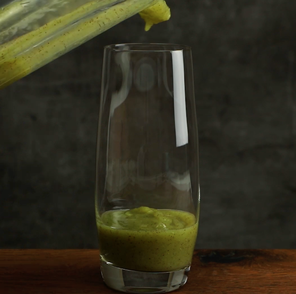 2.) Gib die Kiwi-Eiswürfel wieder in den Mixer und fülle damit ein hohes Glas zu etwa einem Drittel auf.