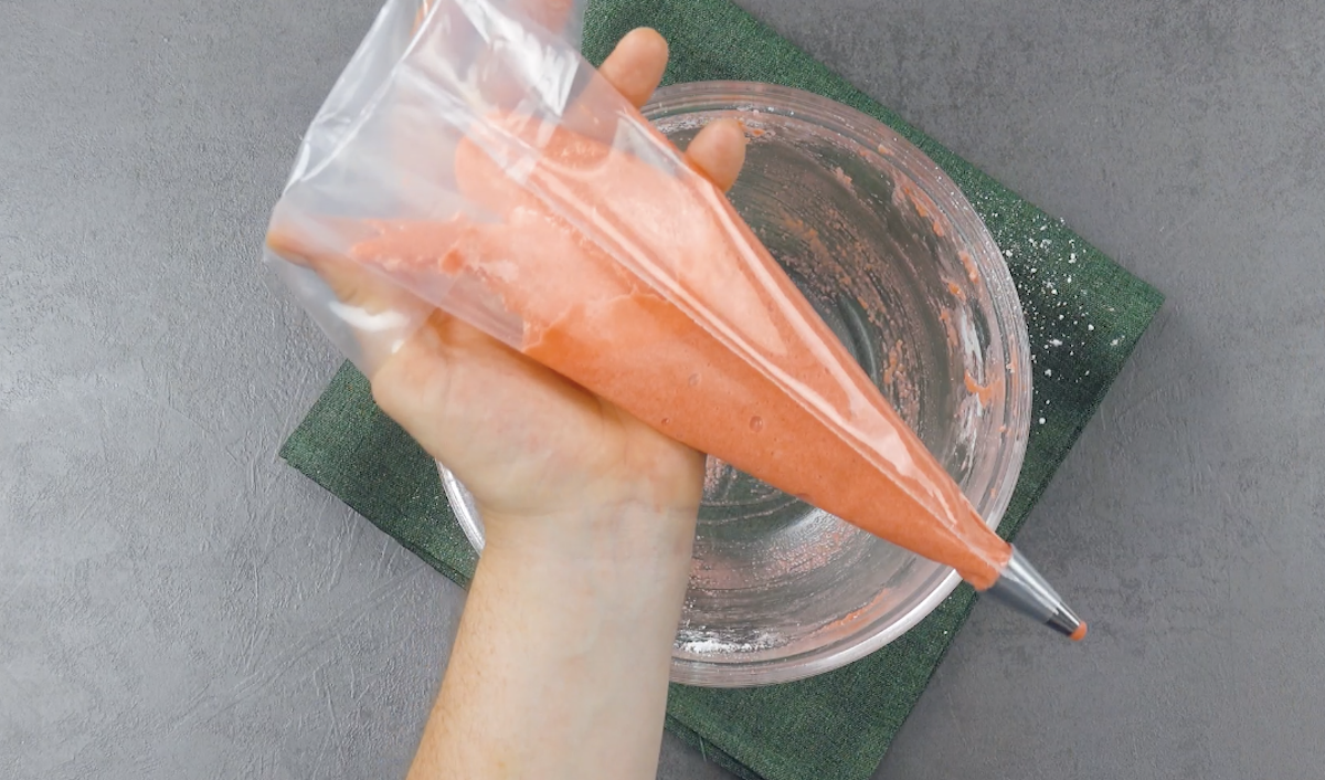 3.1 Schlage das Eiweiß mit einem Handrührgerät auf. Gib dann Zucker hinzu und schlage es weiter. Gib vorsichtig rote Lebensmittelfarbe hinzu und schlage die Masse zu einem festen Baiser. Siebe Puderzucker und gemahlene Mandeln in die Masse und hebe alles vorsichtig unter. Fülle die Masse in einen Spritzbeutel mit Lochtülle.