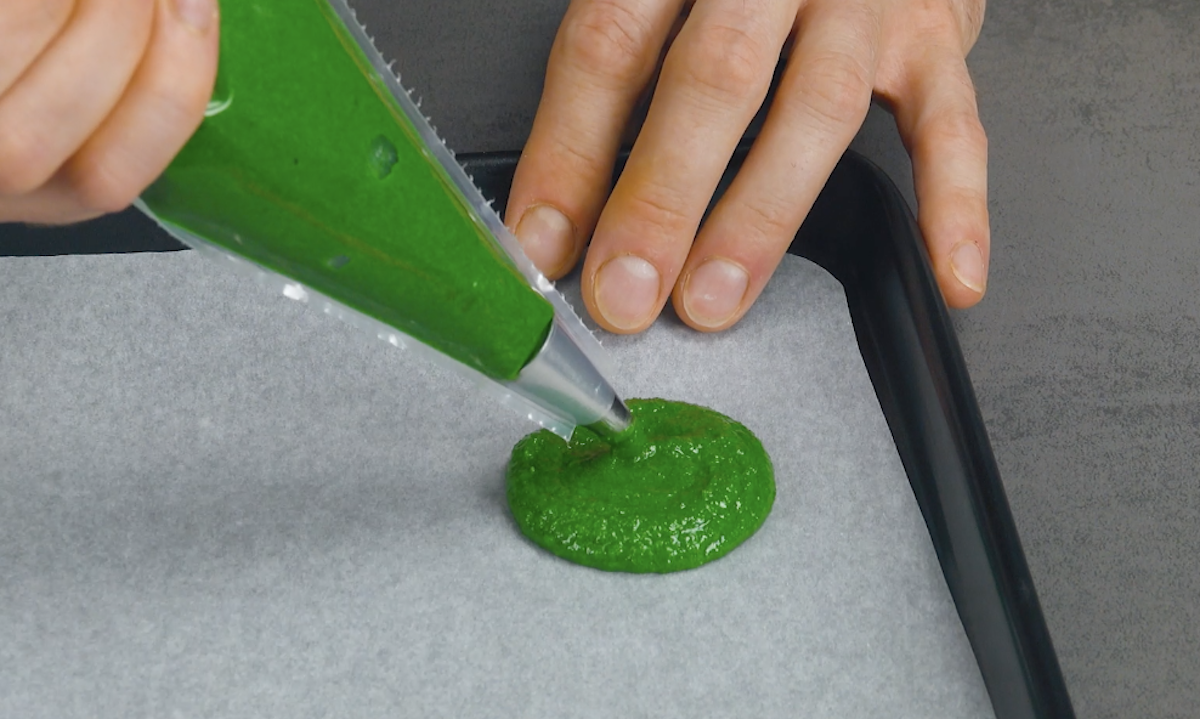 3.4 Gib die grüne Masse ebenfalls spiralförmig auf ein mit Backpapier ausgelegtes Backblech. Lass auch sie 10 bis 12 Minuten antrocknen und schiebe das Blech dann ebenfalls bei 150 °C Ober- und Unterhitze für 12 bis 15 Minuten in den Ofen.