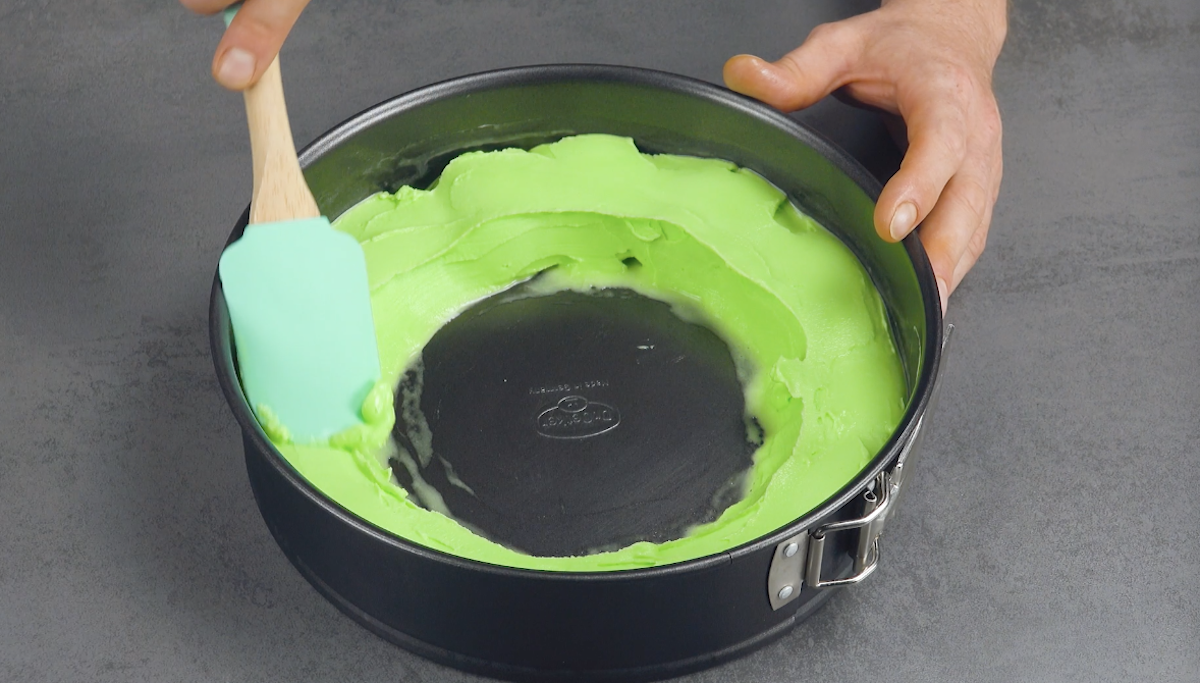 1.1 Verteile das Apfelsorbet ringförmig am Rand der Springform und friere es für etwa 30 Minuten ein.
