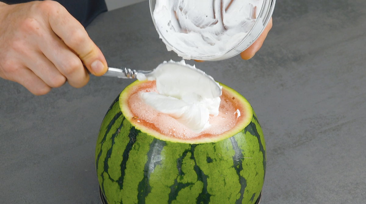 2.3 Hebe geschlagene Sahne unter und stelle die gefüllte Wassermelone für 2 Stunden in den Gefrierschrank.