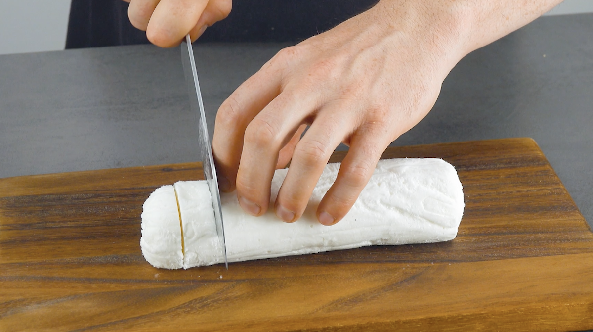 3.5 Forme das weiße Eis in Frischhaltefolie zu einer Wurst und friere es anschließend nochmals für eine Stunde ein. Schneide die Wurst dann in Scheiben.