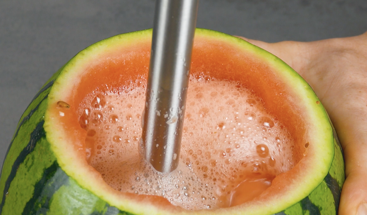 2.1 Schneide den Deckel der Wassermelone ab und püriere mit einem Pürierstab das komplette Fruchtfleisch.