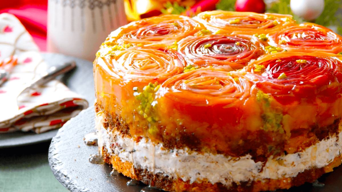 Die zu Rosen geformten Apfelbahnen, die hübschen Platzchenplatten, die süße Karamellschicht und das cremige Nugat machen die Tarte Tatin zu einem Weihnachtsdessert, das jedes Jahr aufs Neue eine Freude ist.