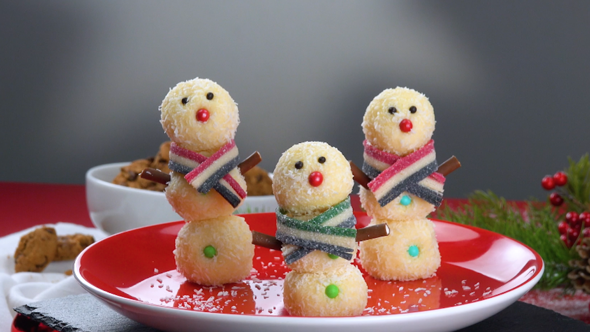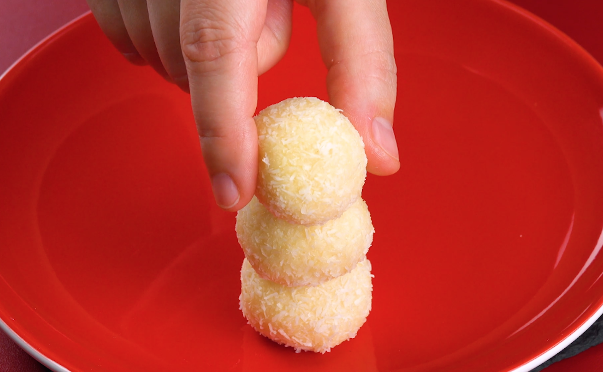 1.2) Forme dann aus der Masse 3 Kugeln, wälze diese inden noch verbliebenen Kokosraspeln und setze sie aufeinander, damit sie die Gestalt eines Schneemanns einnehmen.