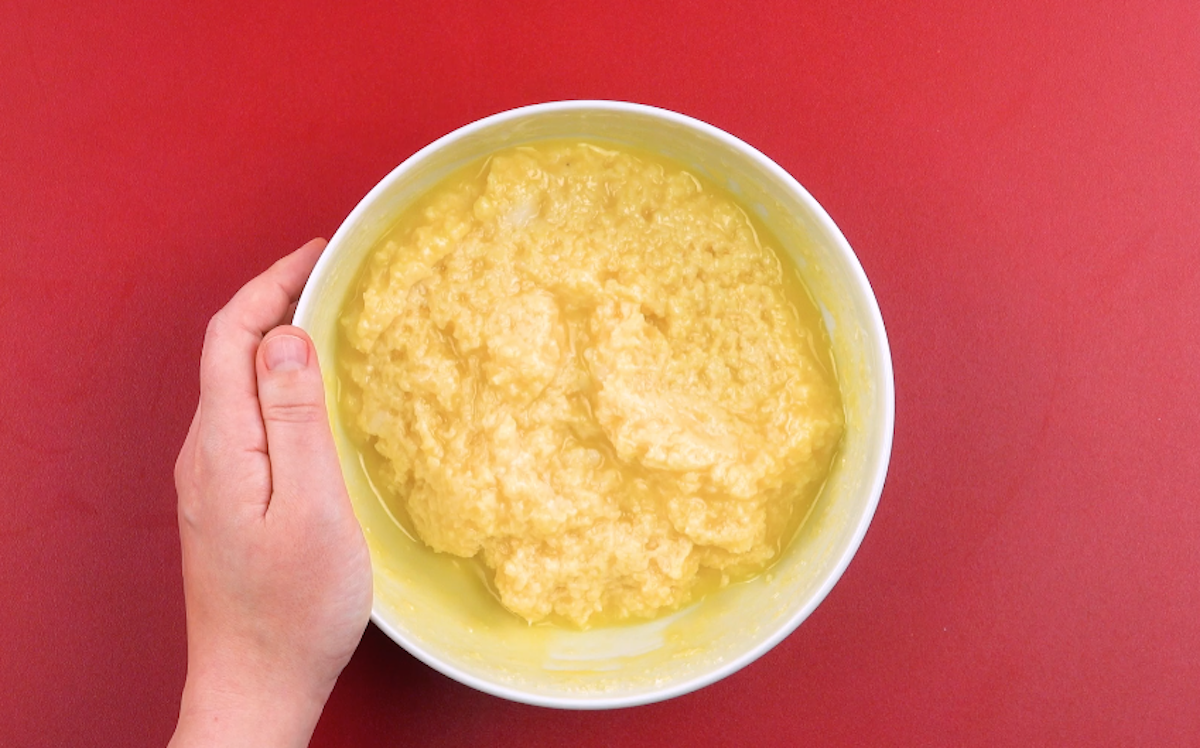 2.2) Forme die Masse per Hand zu einer ovalen Kugel und stelle diese aufrecht auf eine Arbeitsfläche.