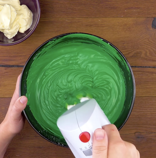 2.) Um die Buttercreme zuzubereiten, schlage die Butter mit einem Handrührgerät schaumig auf und füge beim Rühren den Puderzucker zu. Zum Schluss mischst du den Frischkäse unter. Nimm sechs Esslöffel von der Creme ab. Die übrige Creme färbst du mit grüner Lebensmittelfarbe ein, bis die von dir gewünschte Farbintensität erreicht ist.
