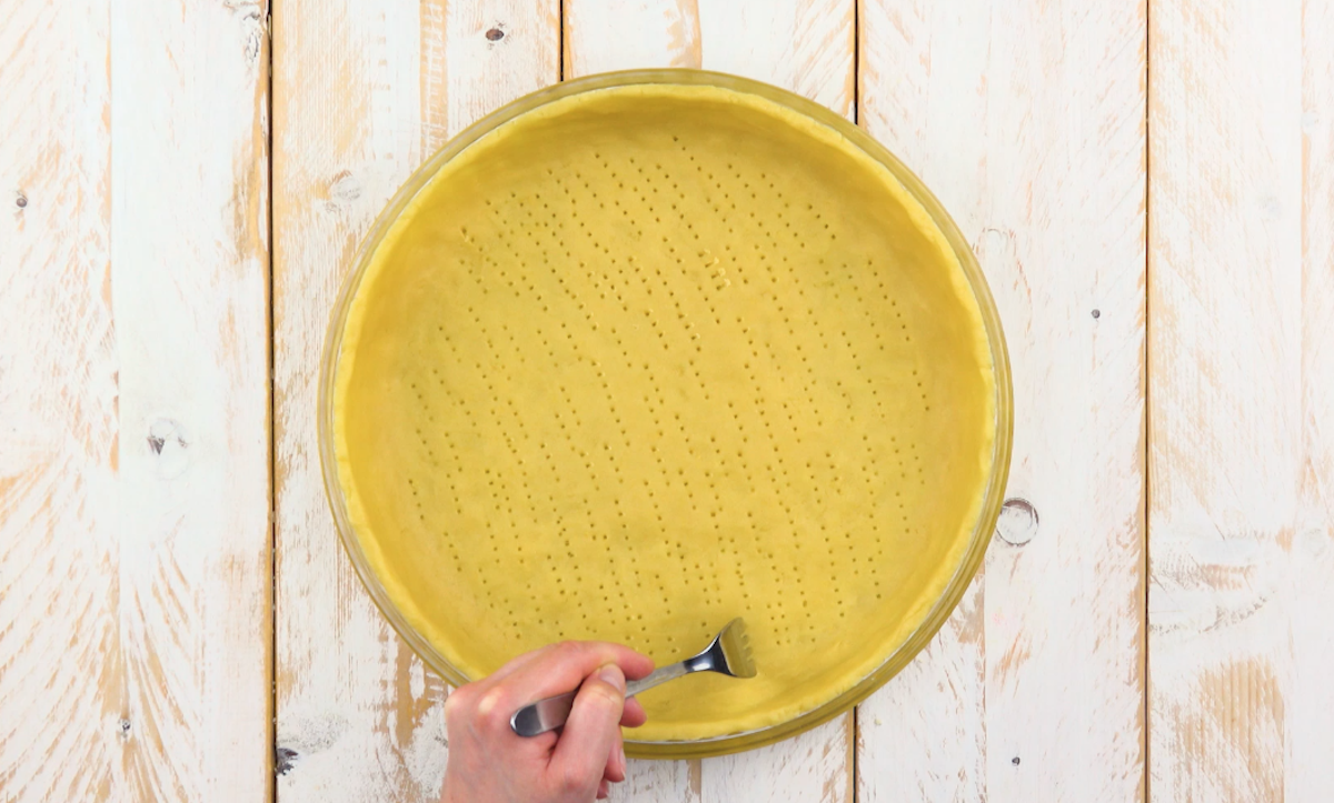 1.) Knete Mehl, Butter und Ei zu einem Teig, forme diesen zu einer Kugel und lass ihn eine Stunde im Kühlschrank ruhen. Anschließend drücke ihn in einer Quicheform aus. Achte dabei darauf, dass der Boden gleichmäßig dick ist. Stich den Teig mit einer Gabel ein, um zu vermeiden, dass er beim Backen Blasen wirft. Nun backe ihn bei 175 °C Umluft für 20 Minuten.