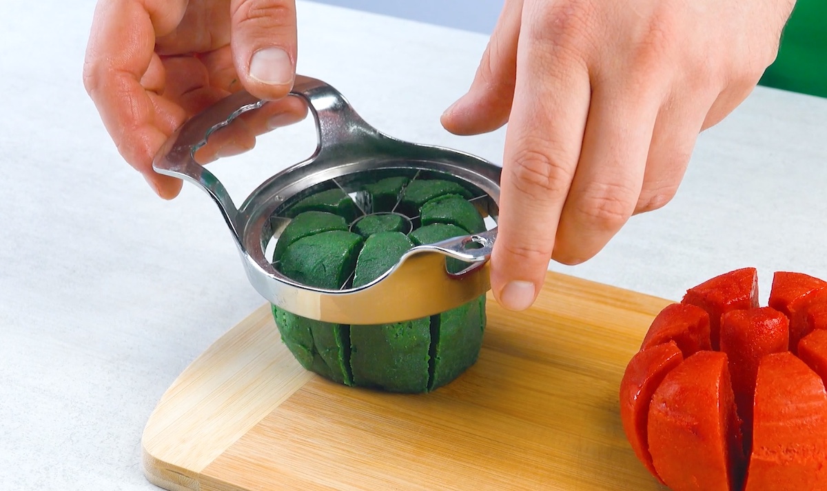 2. Schneide die Keksteig-Kugeln nun mit einem Apfelschneider durch, sodass jeweils acht Segmente und ein mittiger Zylinder entstehen.
