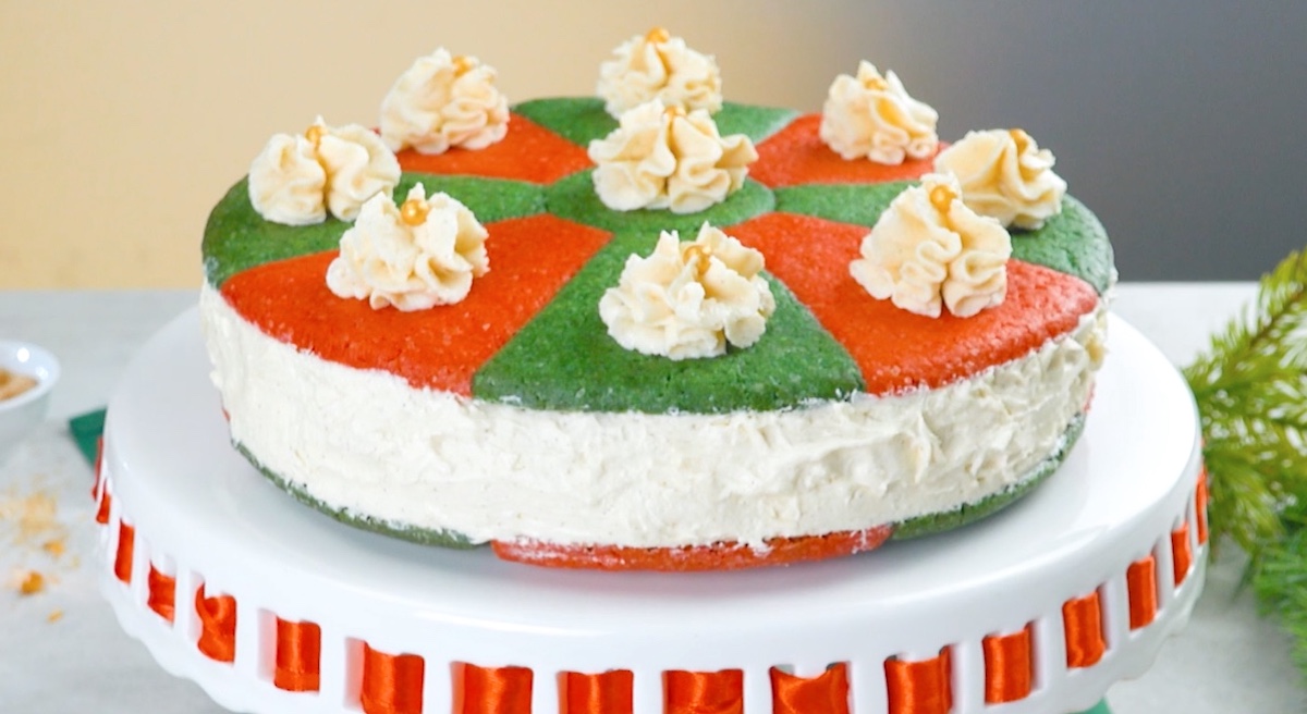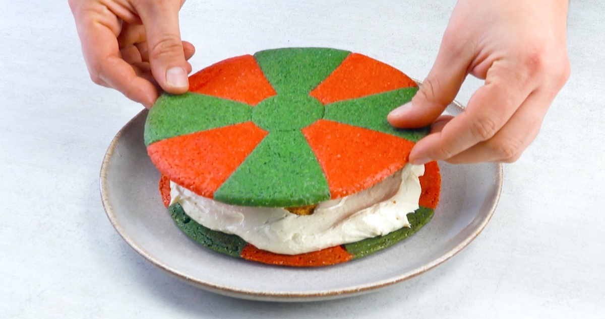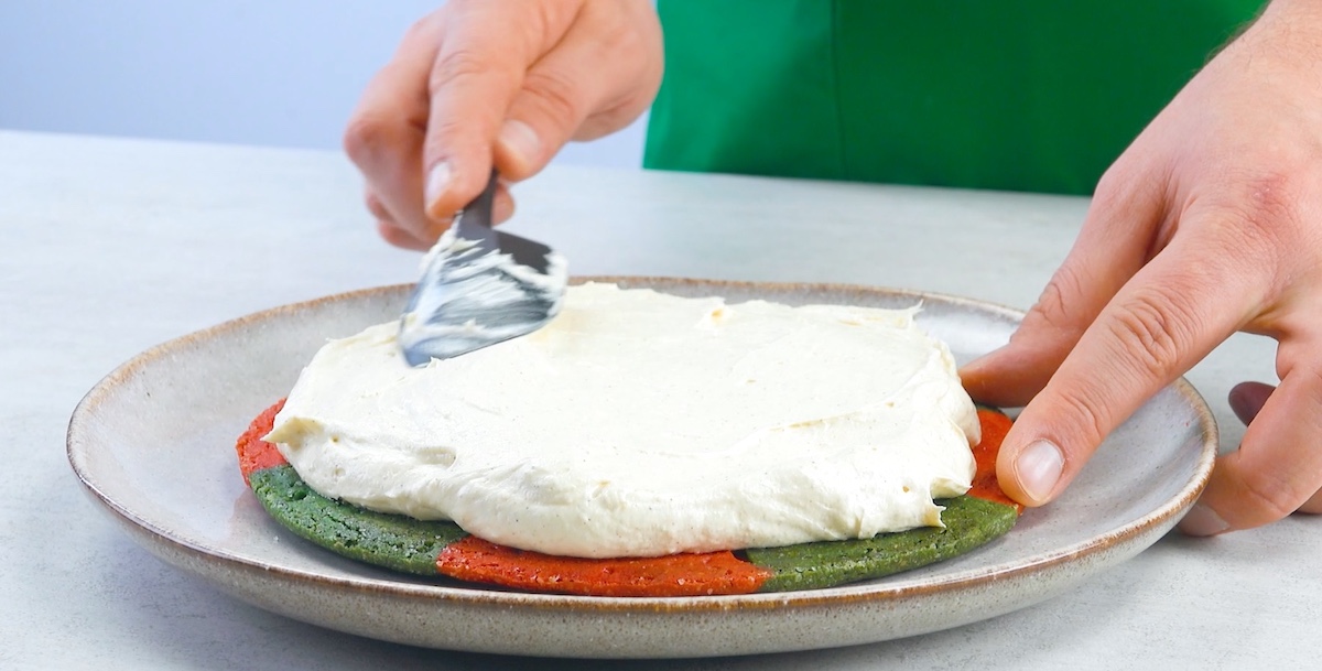 Die Farben der Riesenkekse verleihen der Torte ein weihnachtliches Aussehen und der Lebkuchen in der Frischkäsecreme sorgt für den weihnachtlichen Geschmack – diese wunderschöne Weihnachtstorte ist der Hit auf jeder Weihnachtstafel.