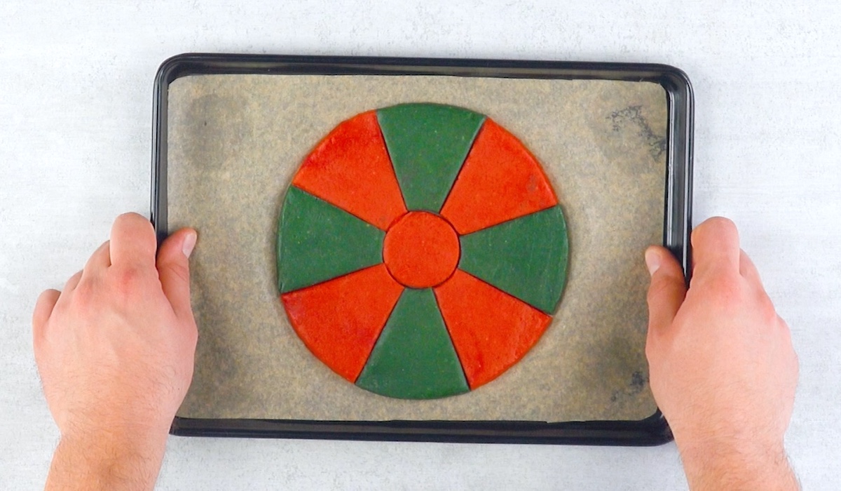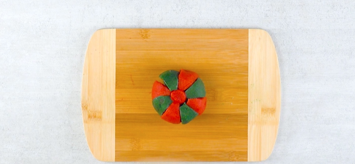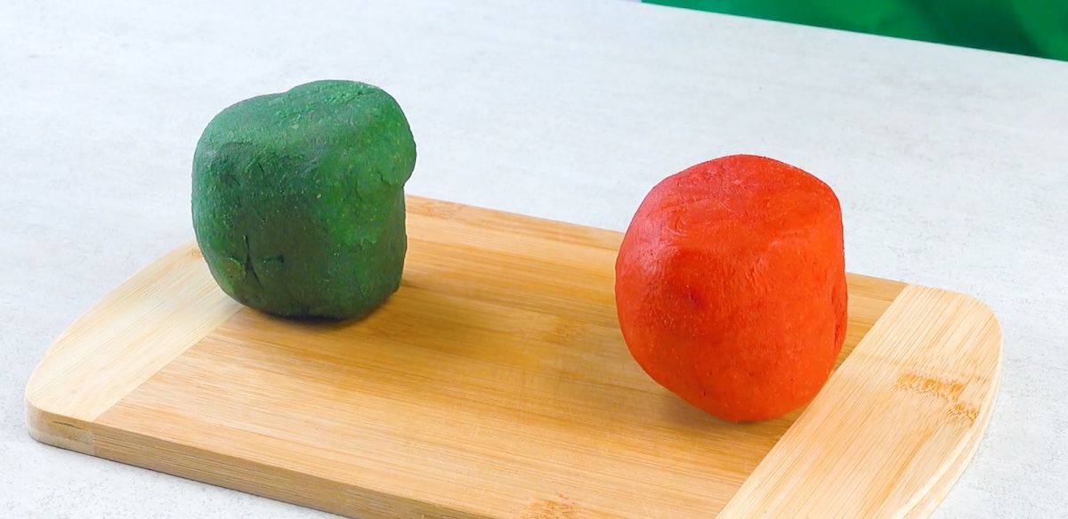 1. Verknete für den Keksteig alle Zutaten rasch mit den Händen; der Zucker muss sich dabei nicht komplett auflösen. Halbiere dann den Teig und färbe eine Hälfte rot, die andere grün. Forme dann beide Teighälften zu apfelgroßen Kugeln, schlage sie in Frischhaltefolie ein und lege sie für 45 Minuten in den Kühlschrank.