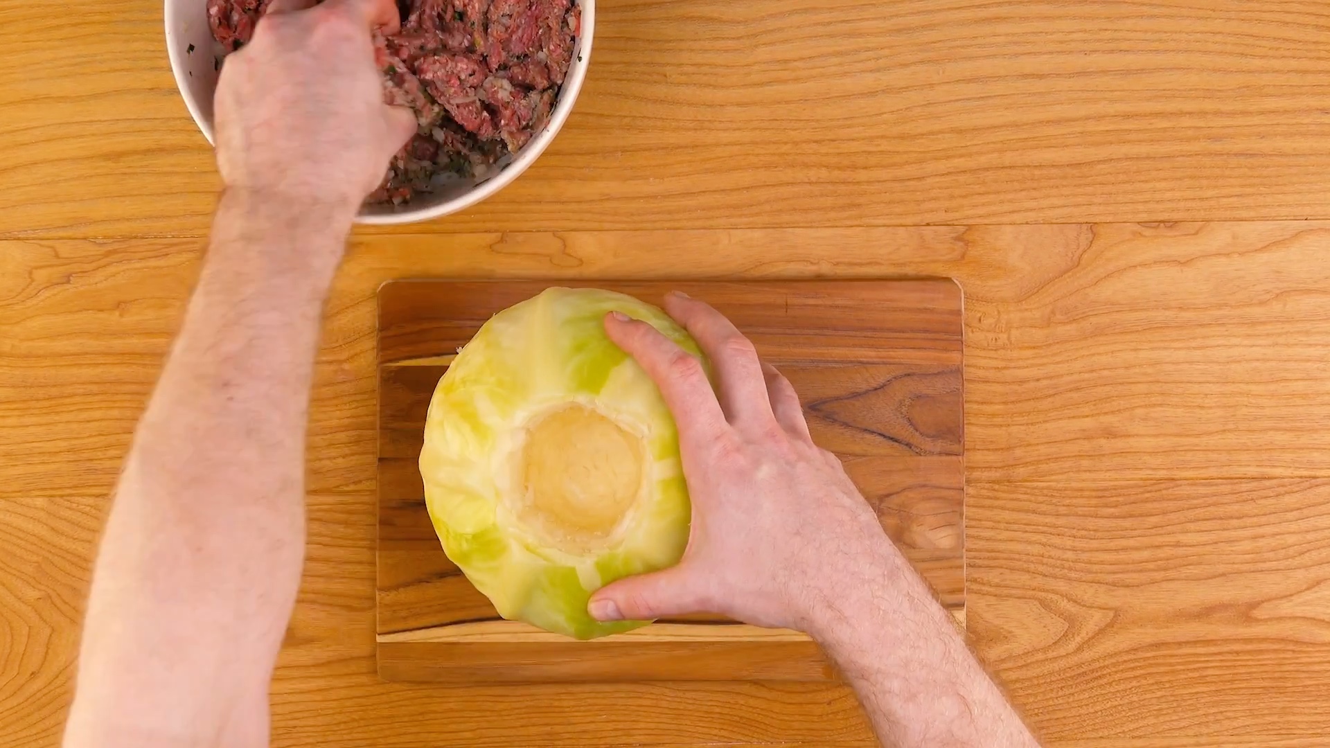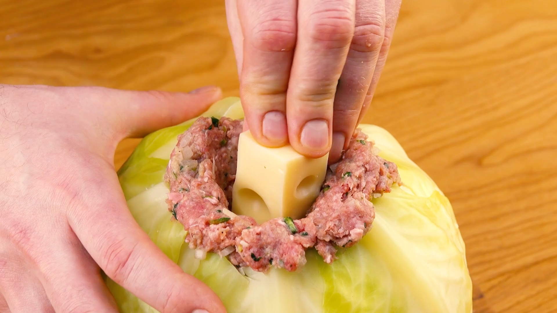 4.) Stopfe das Loch mit Hackfleisch aus. In die Mitte der Masse setzt du den Käsestift. Anschließend umhüllst du den Weißkohl vollständig mit Hackfleisch.