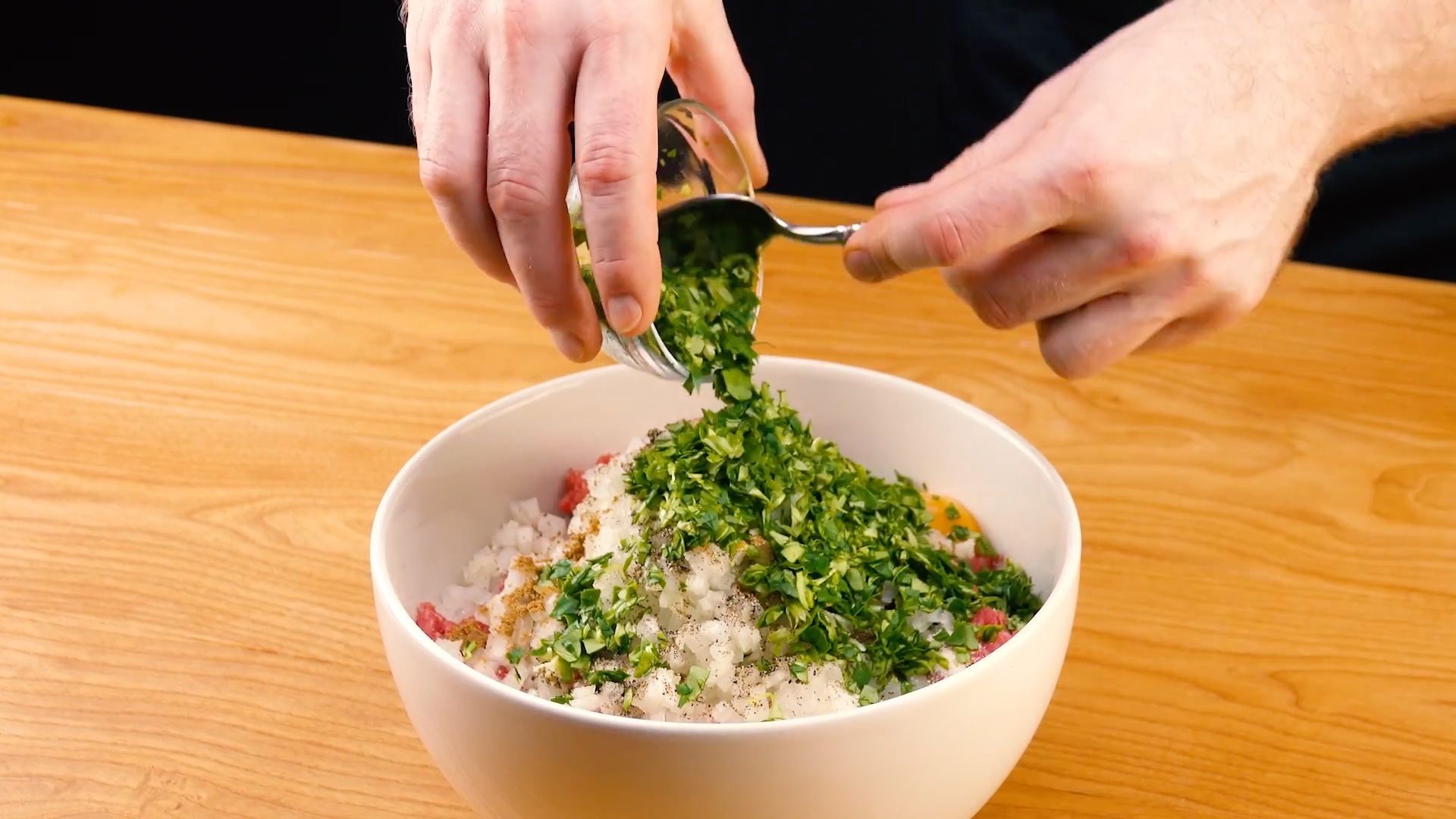 1.) Gib alle Zutaten zum Würzen des Hackfleischs zusammen mit diesem in eine große Schüssel und verknete die Masse gut.