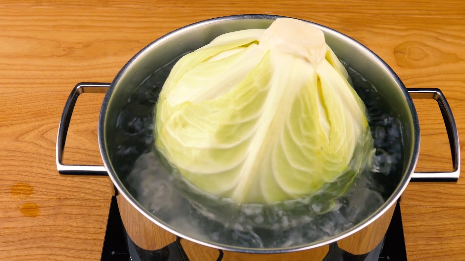 2.) Lege den ganzen Weißkohl in einen großen Topf Wasser und koche ihn rund 20 Minuten.