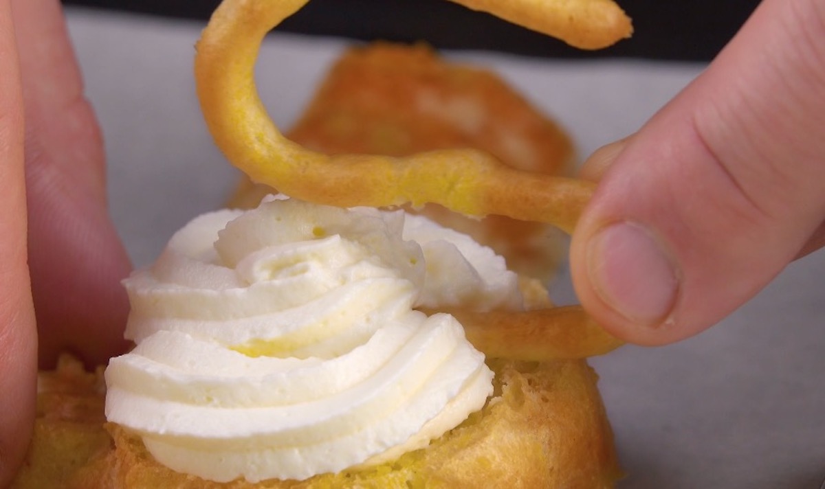 6.) Wenn der gebackene Brandteig abgekühlt ist, schneide mit einem Messer die Oberseite der Schwanen-Körper ab und fülle mit einem Löffel eine kleine Menge der Ganache in den Hohlraum. Gib jetzt noch einen dicken Spritzer der Frischkäse-Creme obendrauf. Führe vorsichtig einen Schwanen-Hals in die Creme ein.
