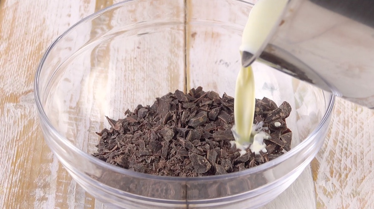 4.) Die Ganache ist ganz einfach herzustellen. Schneide die Schokolade in kleine Stücke und lass sie in heißer Sahne schmelzen. Verrühre alles mit einem Rührbesen zu einer glatten Creme.