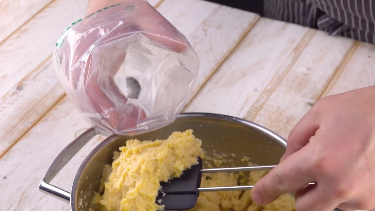 1.) Für diese hübschen Windbeutel-Schwäne musst du zuerst den Brandteig herstellen. Erhitze dafür die Butter in einem Topf und gib Wasser, Salz und Mehl hinzu. Verrühre das Ganze mit einem Kochlöffel zu einem glatten Teig und nimm den Topf von der Herdplatte. Lass alles etwas abkühlen und mische mit dem Handmixer nach und nach die 3 Eier unter. Etwa zwei Drittel des Teiges musst du nun in einen Spritzbeutel mit Sterntülle füllen. Das letzte Drittel kommt in einen Spritzbeutel mit kleiner Lochtülle.