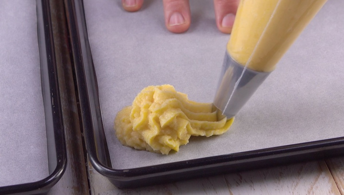 2.) Spritze nun mit der Sterntülle etwa 5 bis 6 kleine Teigmassen, die die künftigen Schwanen-Körper darstellen werden, auf das Backpapier. Schiebe das Blech bei 175 °C Ober- und Unterhitze für 7 bis 10 Minuten in den Ofen.
