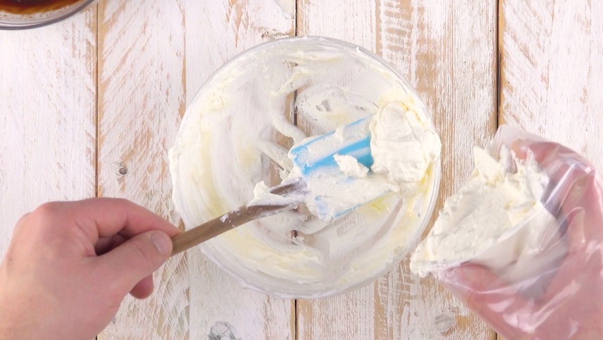 5.) Für die Windbeutel-Füllung benötigst du erstmal nur Frischkäse, Vanillearoma und Zucker. Vermenge alles mit einem Handmixer und hebe die geschlagene Sahne unter. Fülle die Masse wieder in einen Spritzbeutel mit Sterntülle.