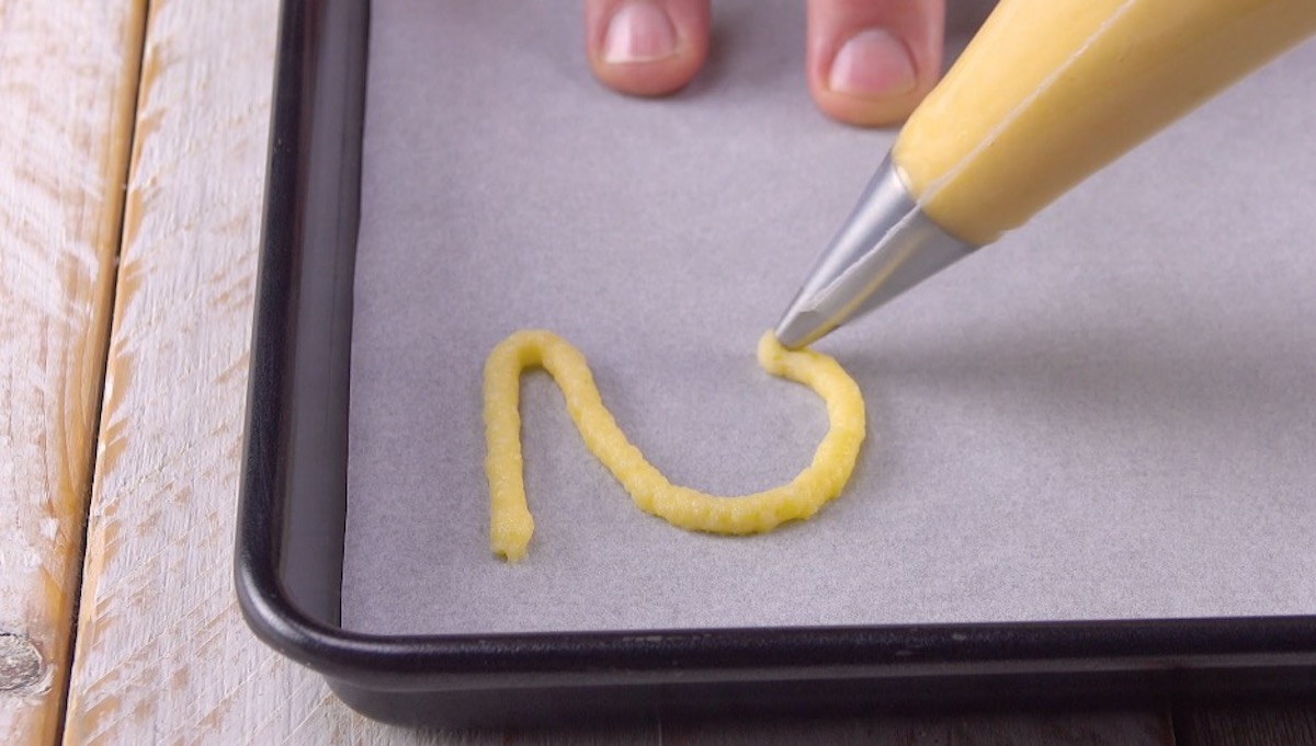 3.) Nun müssen die künftigen Schwanen-Hälse auf das Blech aufgebracht werden. Nimm dazu den Spritzbeutel mit der kleinen Lochtülle und spritze 5 Mal eine „2“ auf das Blech. Gib es anschließend bei 175 °C Ober- und Unterhitze für ca. 20 Minuten in den Ofen.