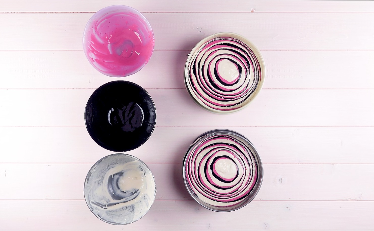 3.) Nimm nun zwei gefettete Springformen zur Hand und gieße eine Kelle des weißen Teigs in die Mitte der beiden Formen. Darauf schöpfst du mittig jeweils einen Klecks des schwarzen und darauf einen des pinkfarbenen Teigs. Dies wiederholst du in derselben Reihenfolge so lange, bis sich der Teig vollständig in den Formen befindet.