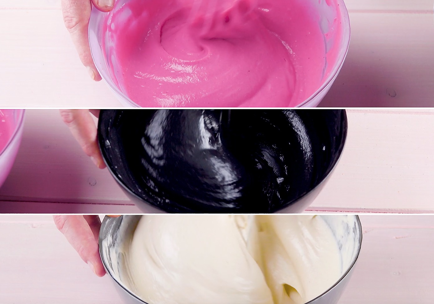 2.) Teile den Teig nun zu gleichen Teilen in 3 Schüsseln auf und rühre jeweils die pinkfarbene, die schwarze und die weiße Lebensmittelfarbe ein.