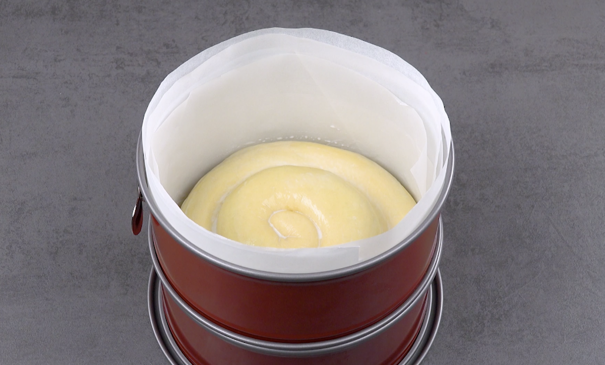 8. Dann kommen die beiden Teigschnecken nacheinander und aufeinander in die Kuchenform. Stelle den zweiten Ring der Springform auf den ersten. Lasse den Teig nochmals 20 bis 30 Minuten gehen. Bepinsle den Teig dann mit Milch und backe alles für 50 Minuten bei 180 °C Umluft.