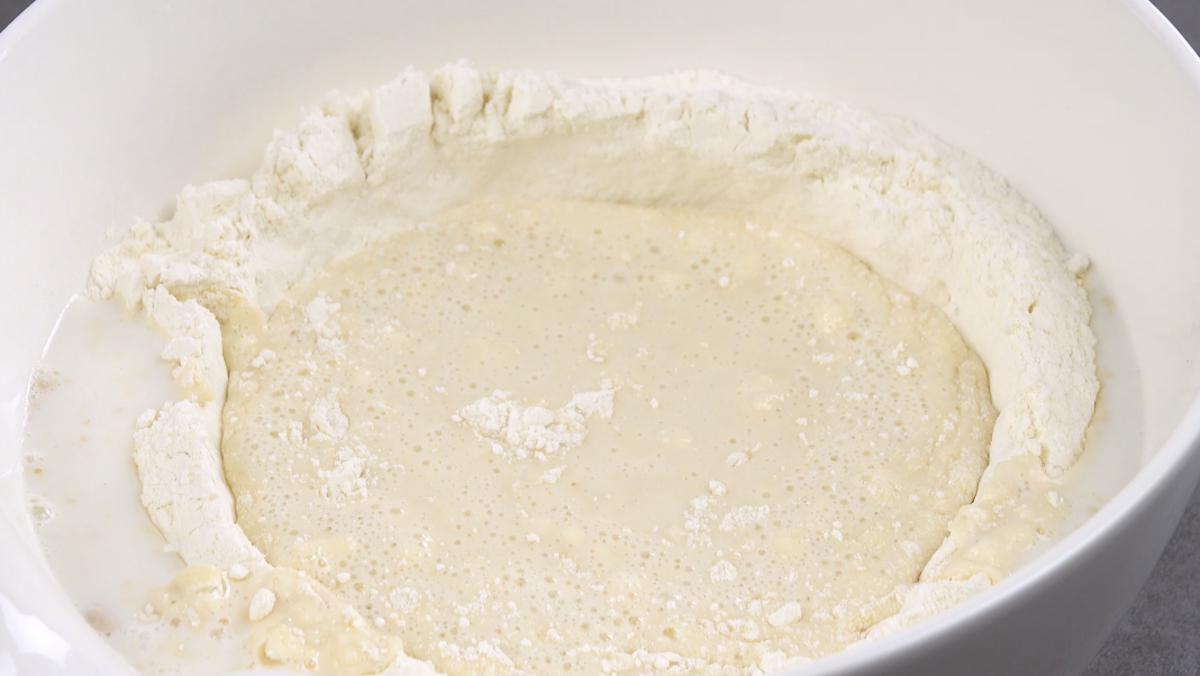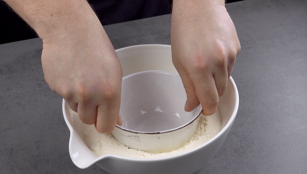 1. Gib das Mehl in eine große Schüssel und forme mithilfe einer kleinen Schüssel in der Mitte eine Kuhle.